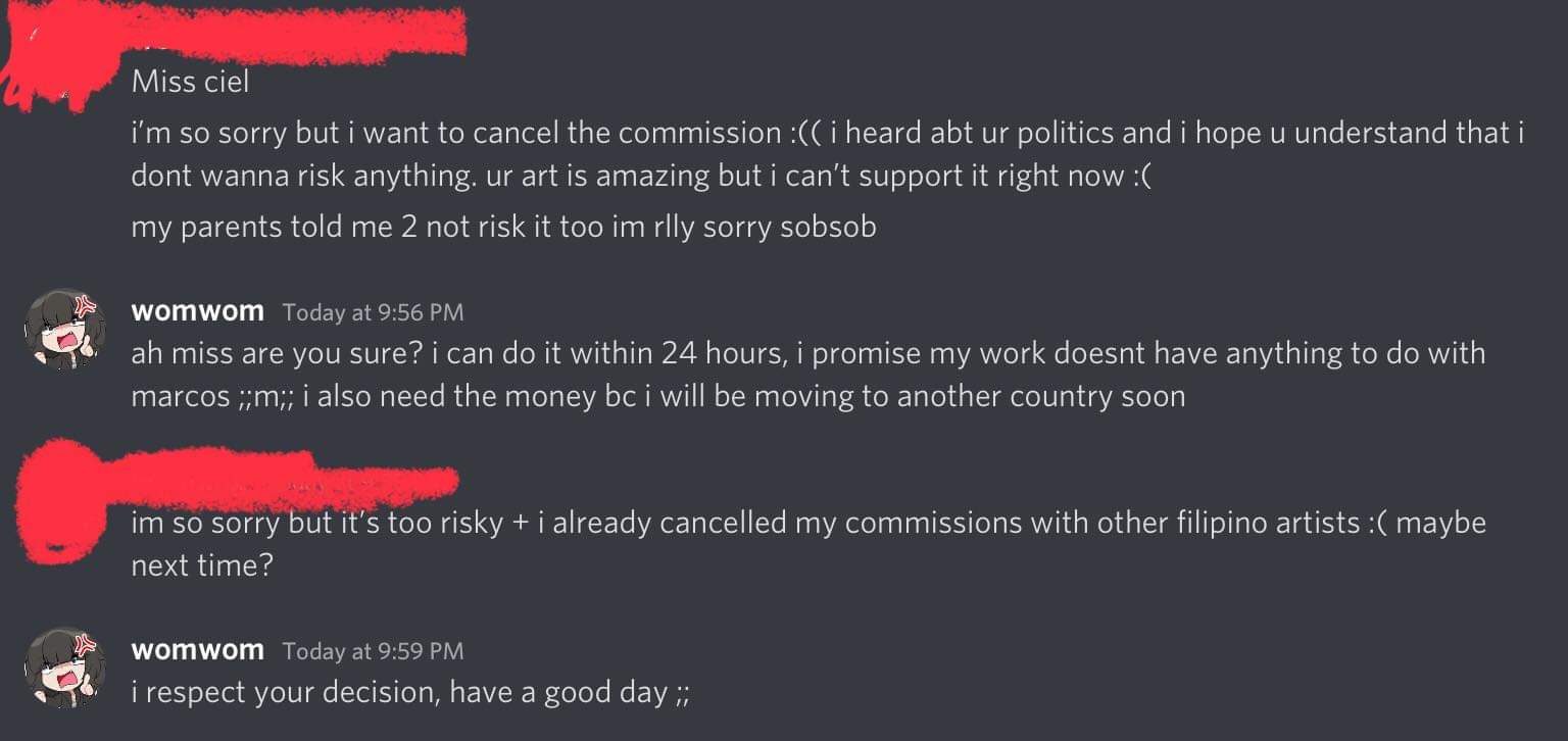 So, of course, the logical thing for people to do in response to is cancel commissions they had planned from Filipino artists. Not because they openly support this guy or anything, but just because they’re in the Philippines.